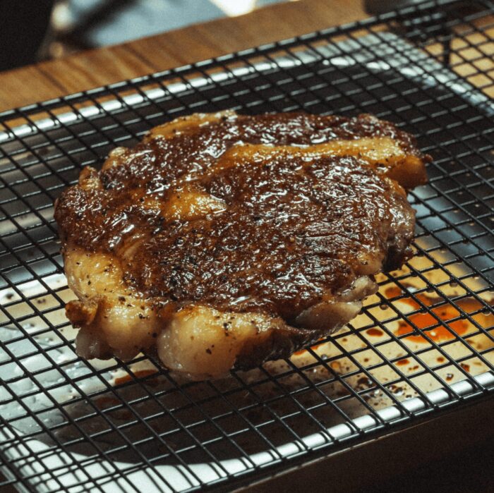Pro tip: smażenie rostbefu warto zacząć od strony pokrywy tłuszczonej – ustaw stek pionowo, tak by tłuszcz przylegał do rozgrzanej patelni. Gdy tłuszcz się wytopi i skórka ładnie się zbrązowi, dopiero wtedy smaż stek klasycznie z obu stron. Dzięki temu mięso nabierze głębi smaku, a tłuszcz zamieni się w złocistą, chrupiącą otoczkę. - Rib eye (antrykot) – król wszystkich steków. Tłusty, intensywny, pełen smaku umami. Dla mięsnych hedonistów.