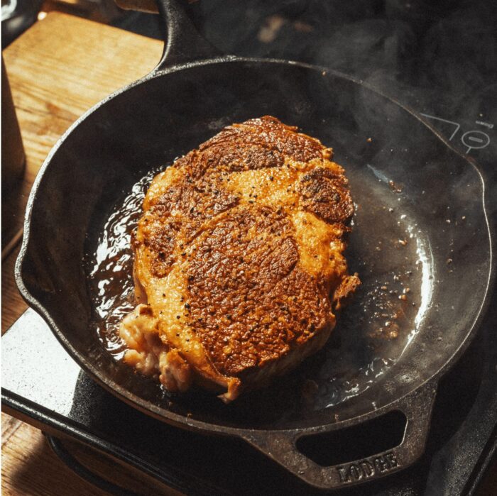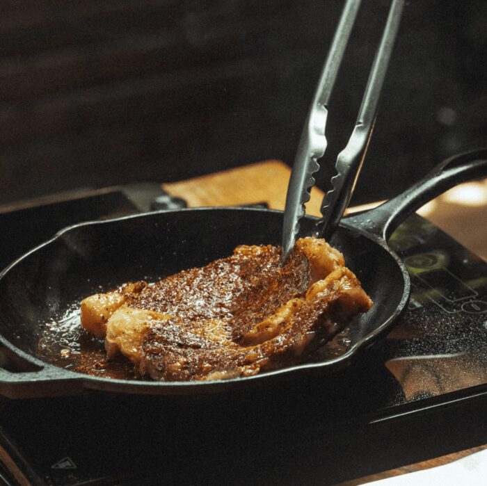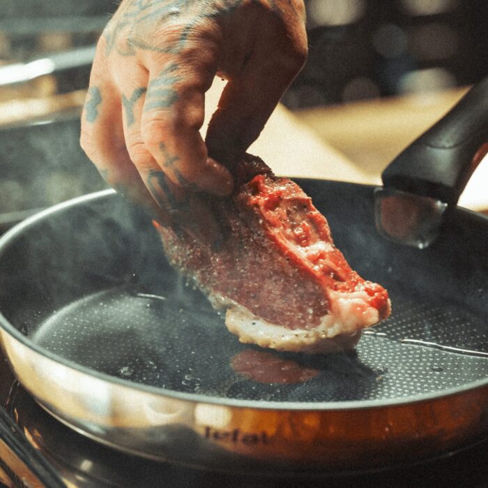 Do smażenia steków w domu świetnie sprawdzi się patelnia tytanowa lub żeliwna, bez powłok PFOA.