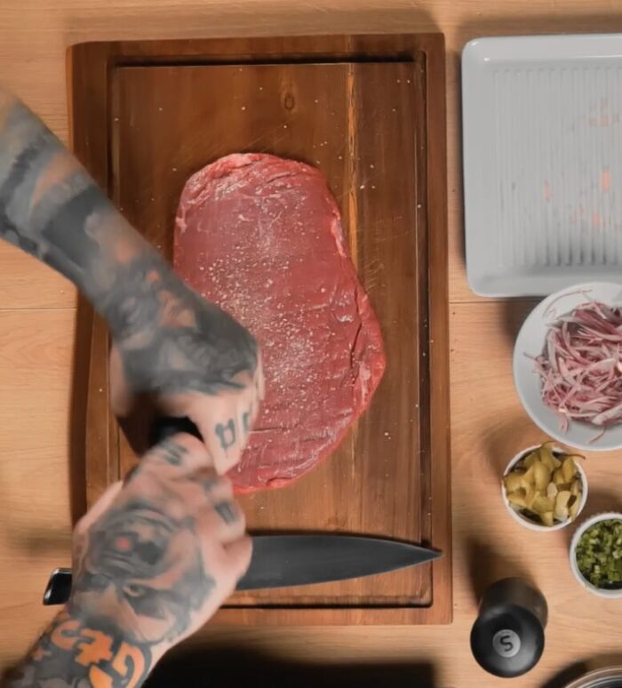 - Pokrój w bardzo cienkie plasterki w poprzek włókien, dzięki czemu mięso będzie delikatne i soczyste.