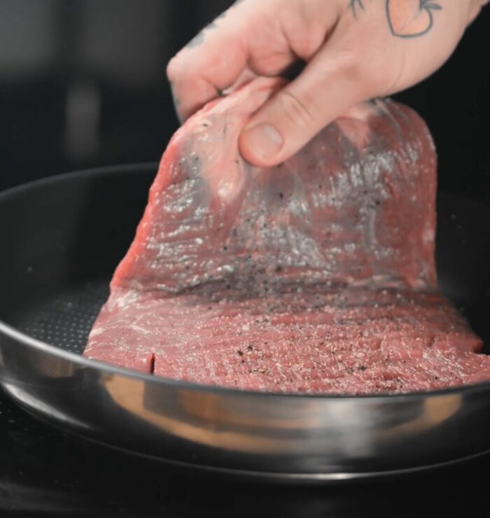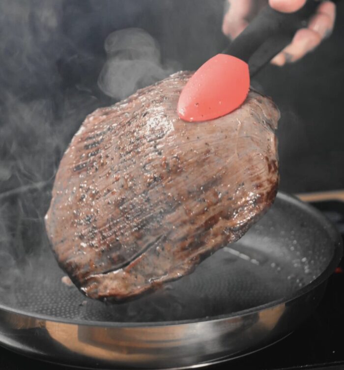 - Smaż flank steak około 4 minuty z każdej strony, aż osiągniesz medium.