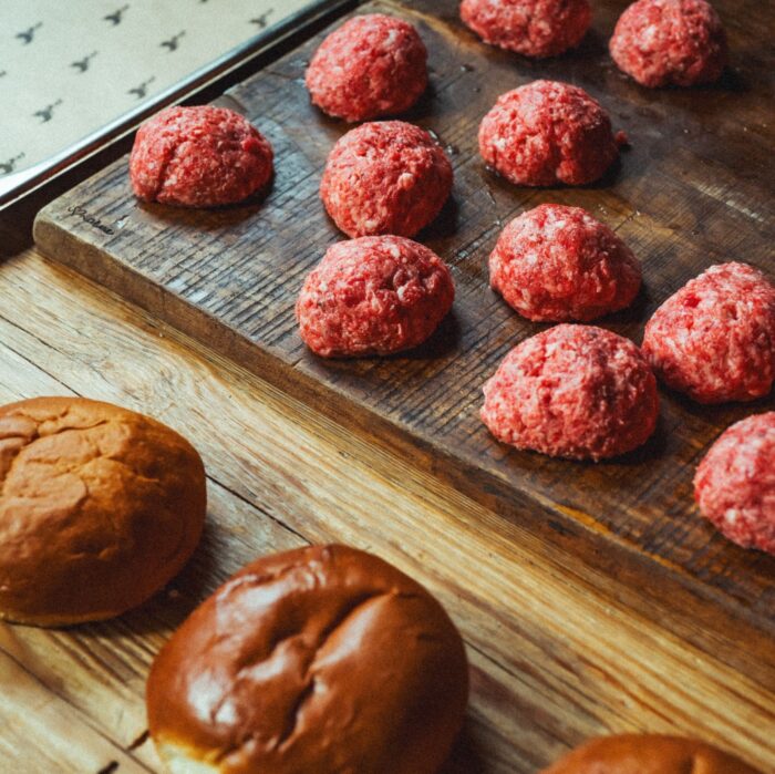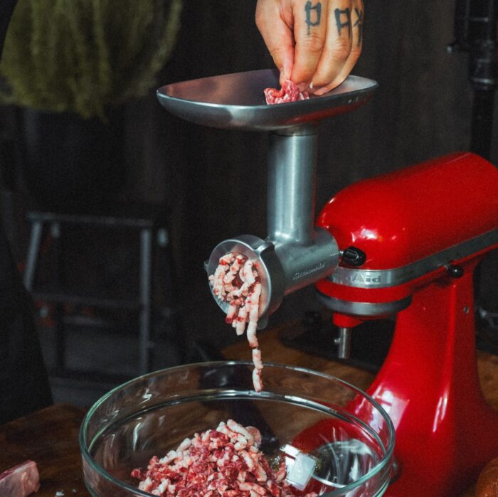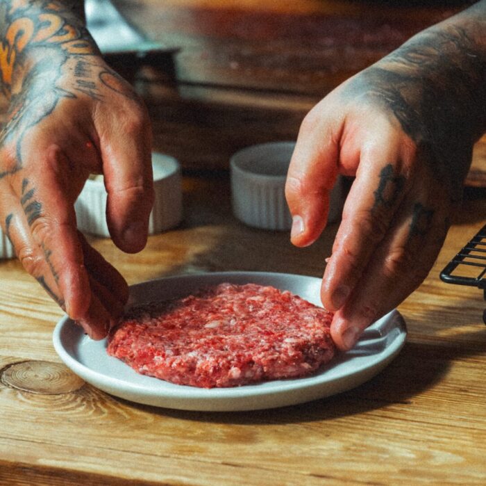 - Zmiel mięso. Rozbratel zmiel dwukrotnie na średnich oczkach. Dzięki temu burger zachowa soczystość i odpowiednią strukturę.
