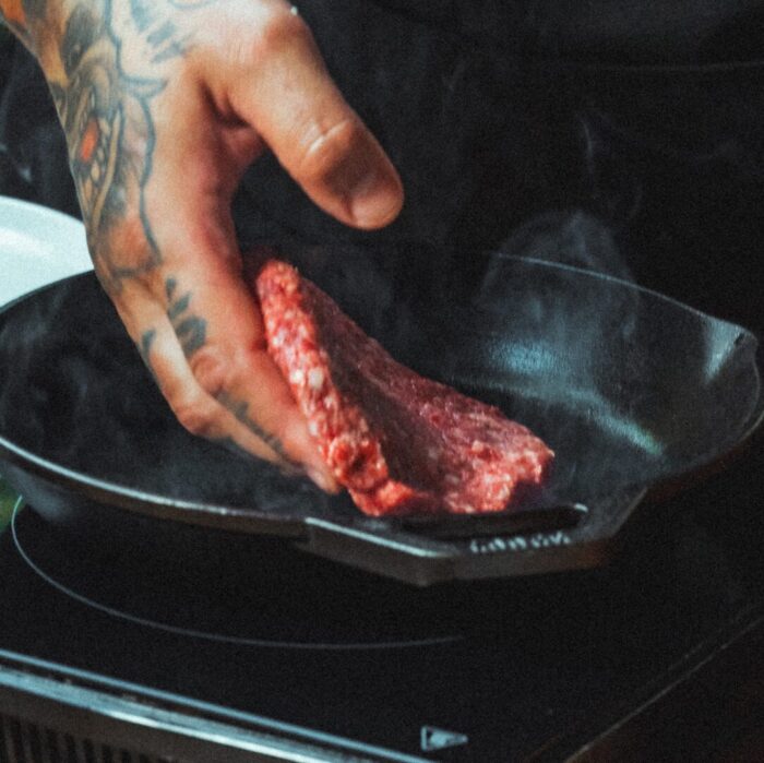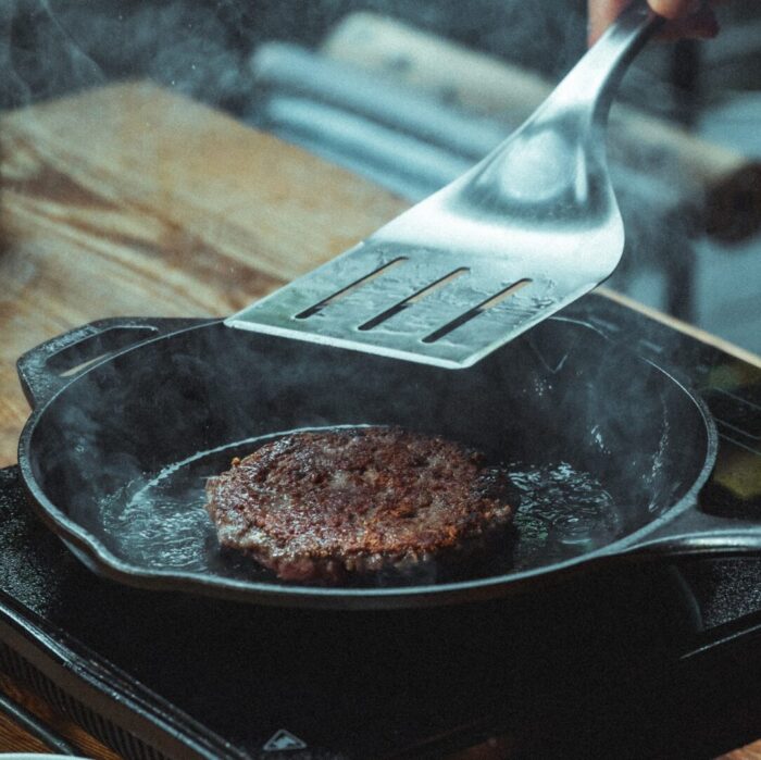- Smażenie burgera.Rozgrzej patelnię bez tłuszczu.