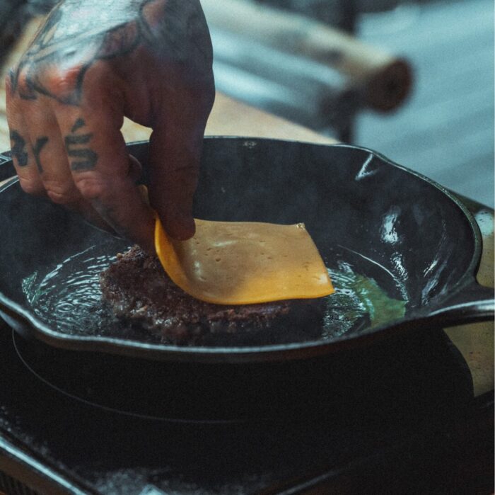 - Połóż gorącego burgera z roztopionym cheddarem.