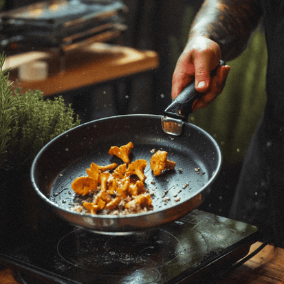 Na klarowanym maśle zeszklij szalotkę, dodaj kurki i smaż krótko na średnim ogniu. Dopraw solą i pieprzem, następnie zalej demi-glace i redukuj do uzyskania intensywnego, aksamitnego sosu.