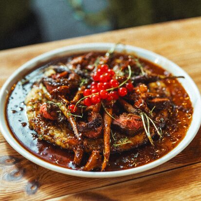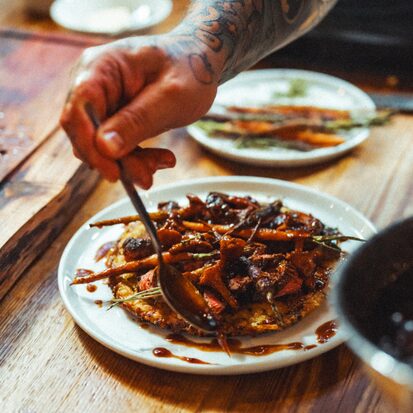 Na rosti ziemniaczanym ułóż soczyste plastry bawety sous-vide, dodaj karmelizowane marchewki i całość polej sosem demi-glace z kurkami.