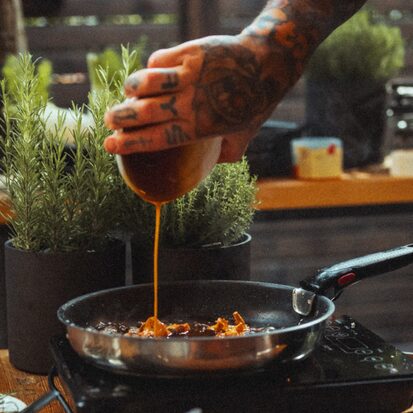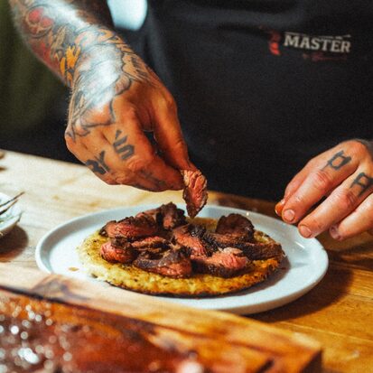 Jeśli baweta wołowa kojarzy Ci się tylko z szybkim stekiem z patelni, ten przepis zmieni twoją perspektywę. Dzięki metodzie sous-vide mięso zachowuje soczystość, a pikantno-dymna nuta chipotle nadaje mu konkretny charakter. Wchodzą więc rosti ziemniaczane na maśle klarowanym, karmelizowane marchewki i klasyczny sos demi-glace z kurkami.