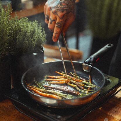 Na osobnej patelni podsmaż marchewki na maśle klarowanym, dodaj cukier, sól i świeży tymianek. Podgrzewaj do momentu lekkiej karmelizacji – mają być słodkie, ale nadal jędrne.